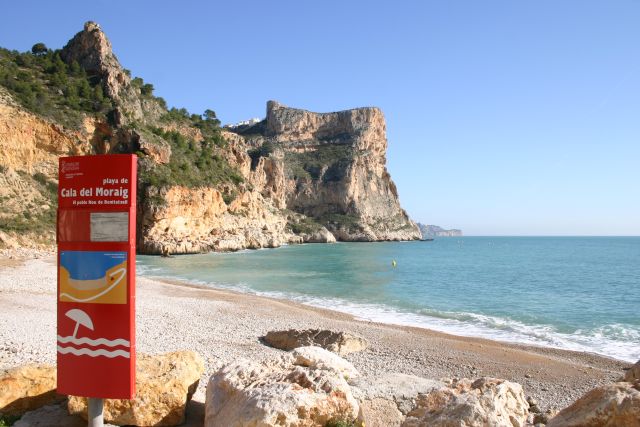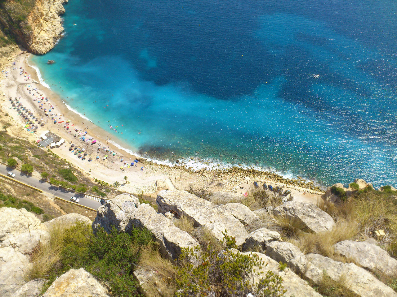 In de diepte verborgen tussen de rotsen is er een prachtig strand. Playa de 'Cala del Moraig'.